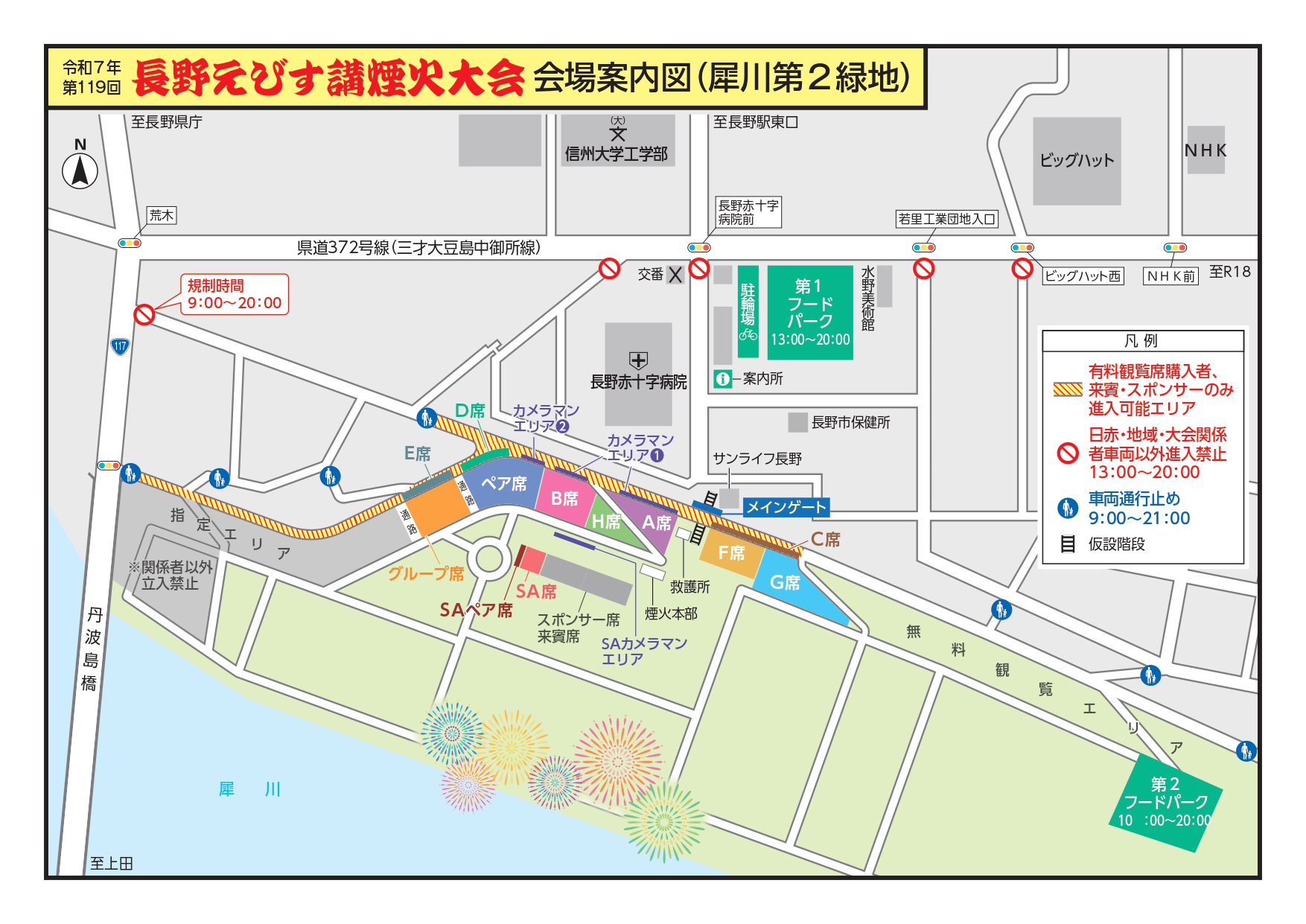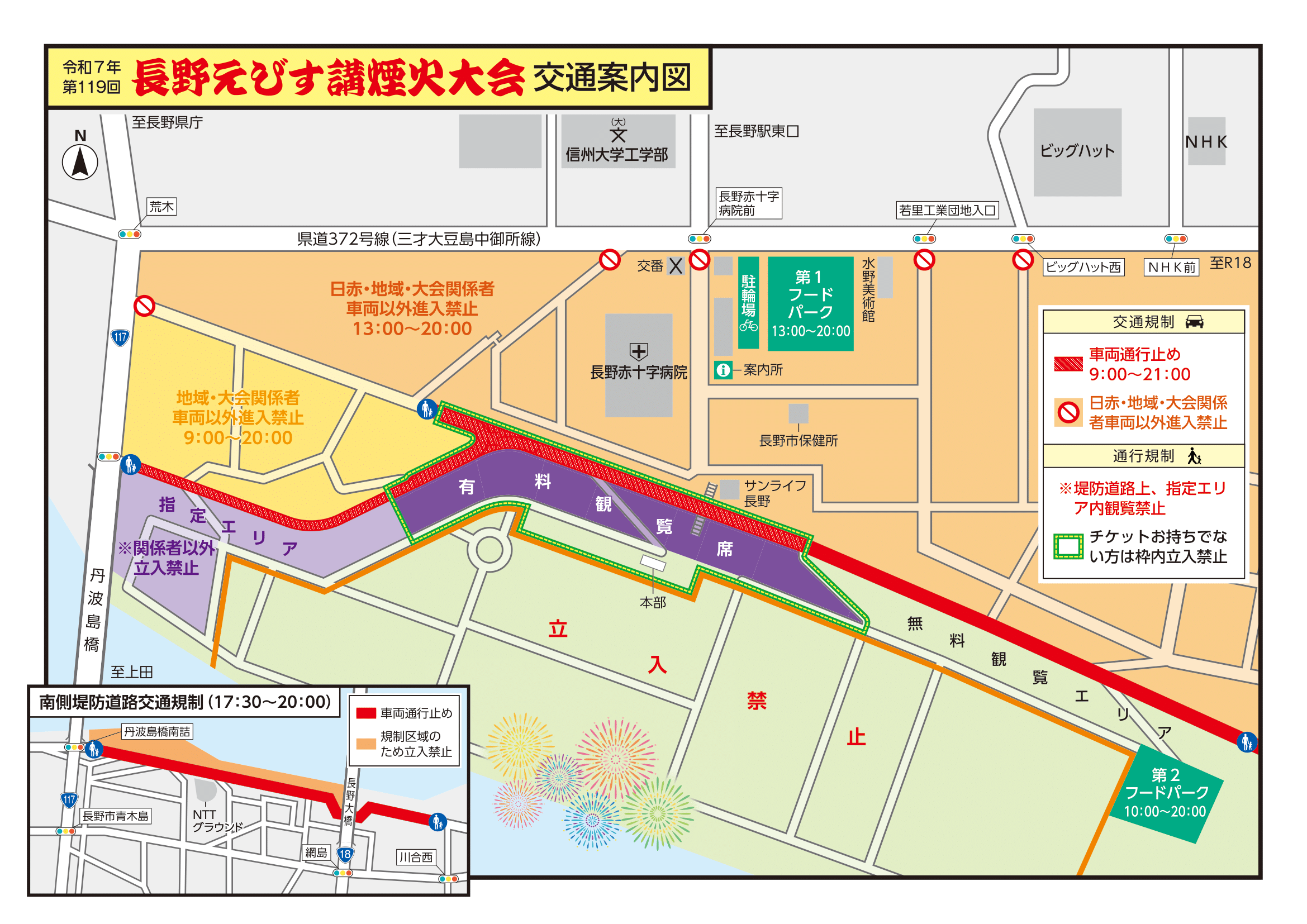 観覧席近くの堤防道路付近(犀川(さいがわ)北側)では09:00~21:00頃まで、長野市道丹波島綱島堤防線付近(犀川南側)は17:30~20:00頃まで車両通行止めなどの規制が行われますのでご注意くださいね。